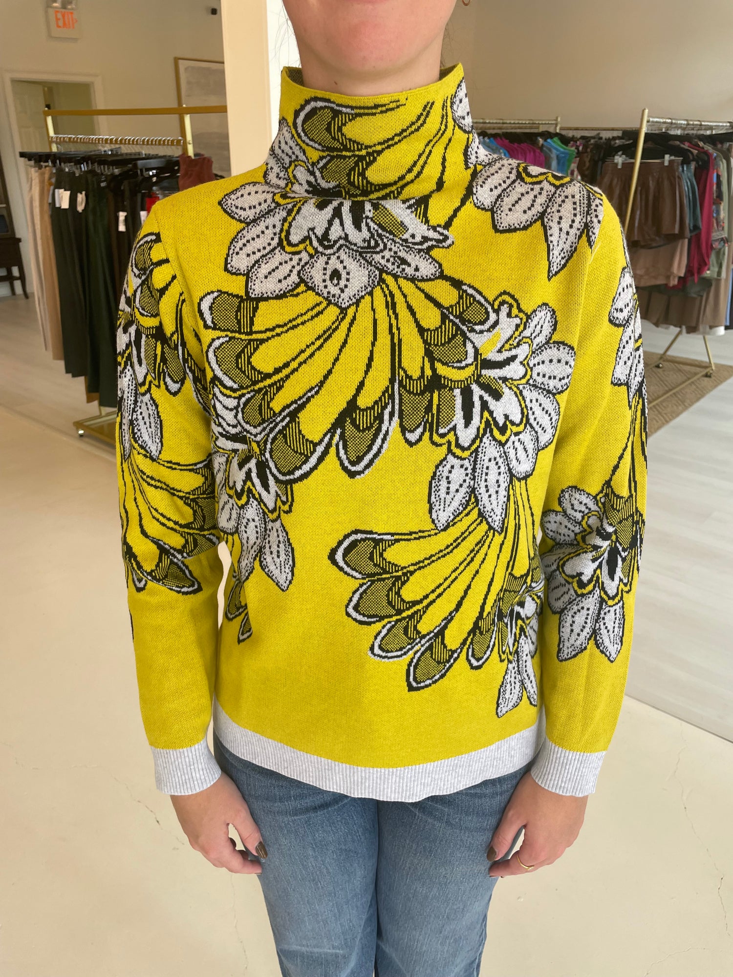 Make a bold yet feminine statement with this Alison Sheri sweater, designed in a vibrant chartreuse base with an oversized floral motif in contrasting black and white. The high neckline and slim silhouette give it a refined, modern edge, while the soft knit ensures effortless comfort. Finished with ribbed trim at the cuffs and hem for a polished touch, this standout piece pairs beautifully with sleek trousers or denim for an artful, elevated look.