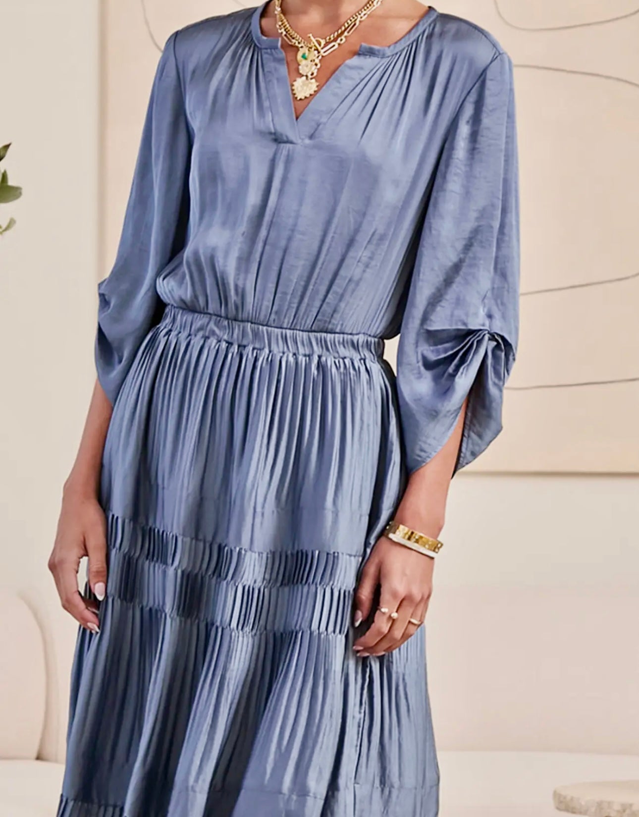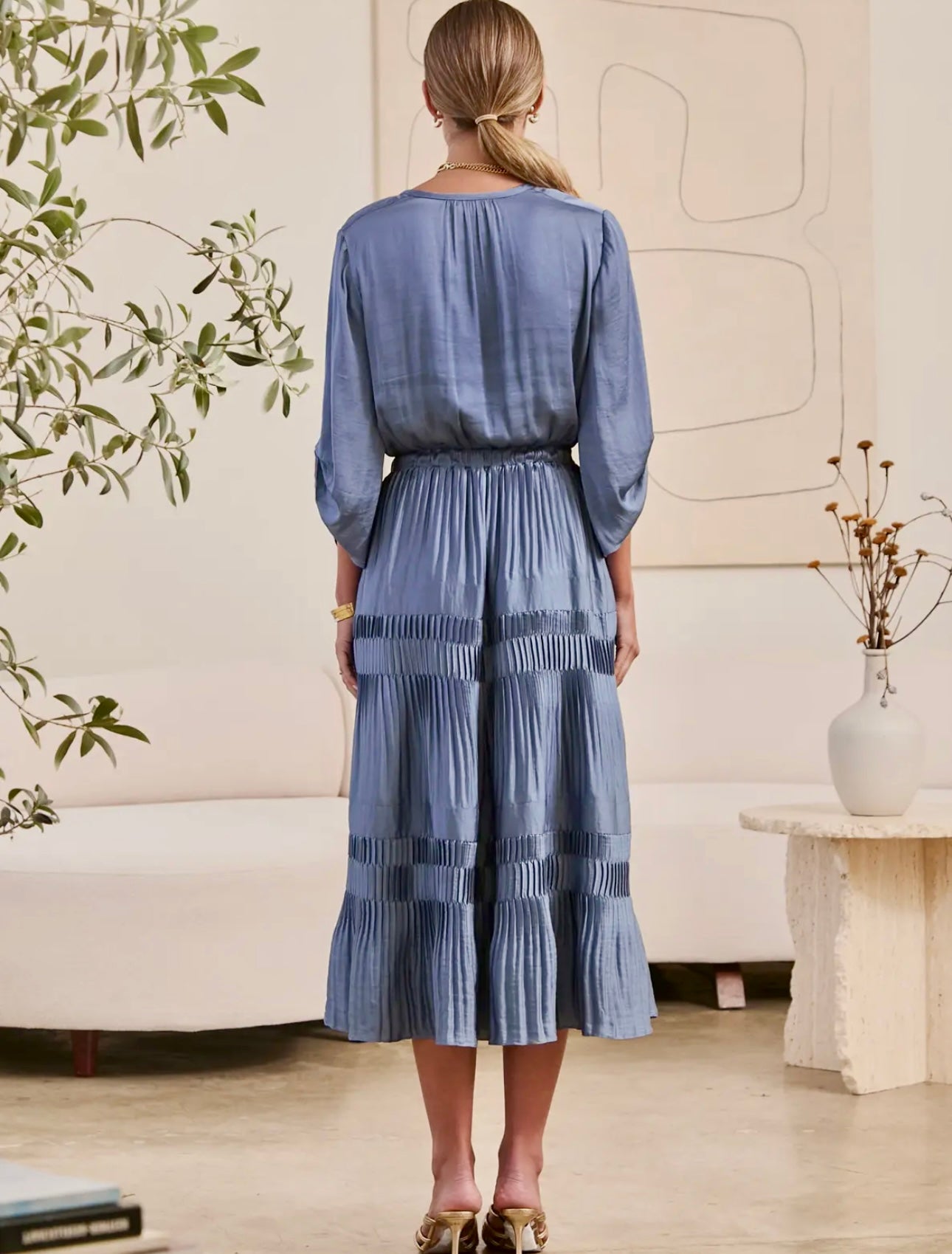 Exude effortless elegance in this dusty blue midi dress, crafted from a silky, lightweight fabric that drapes beautifully. Featuring a flattering split neckline, subtle pleated detailing, and a smocked waist for a comfortable fit, this dress is perfect for both daytime events and evening occasions. The tiered skirt adds graceful movement, making it a timeless piece for your wardrobe.