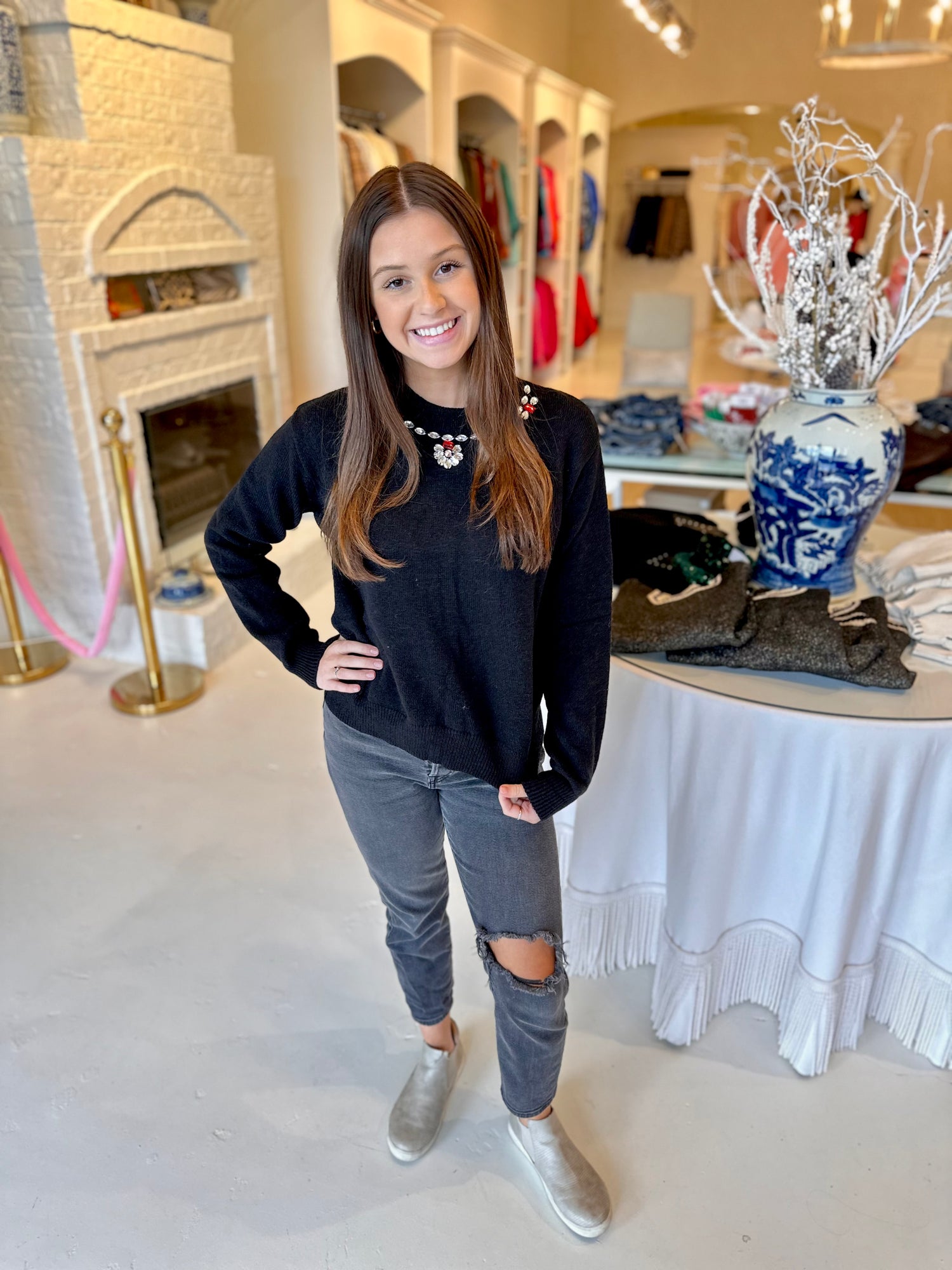 This festive Christmas sweater is giving all the details. This sweater contains jewels around the neckline giving it the perfect little pop for this holiday season!