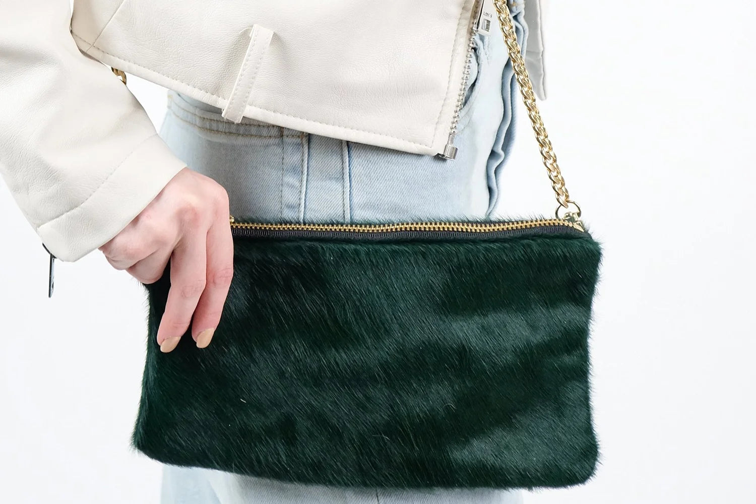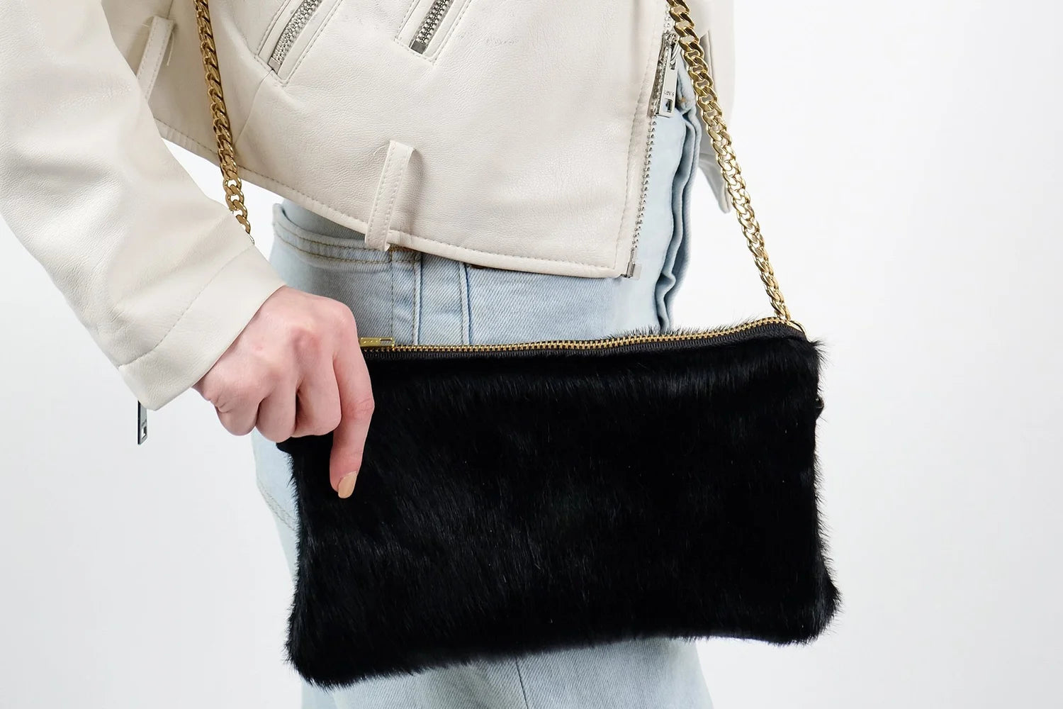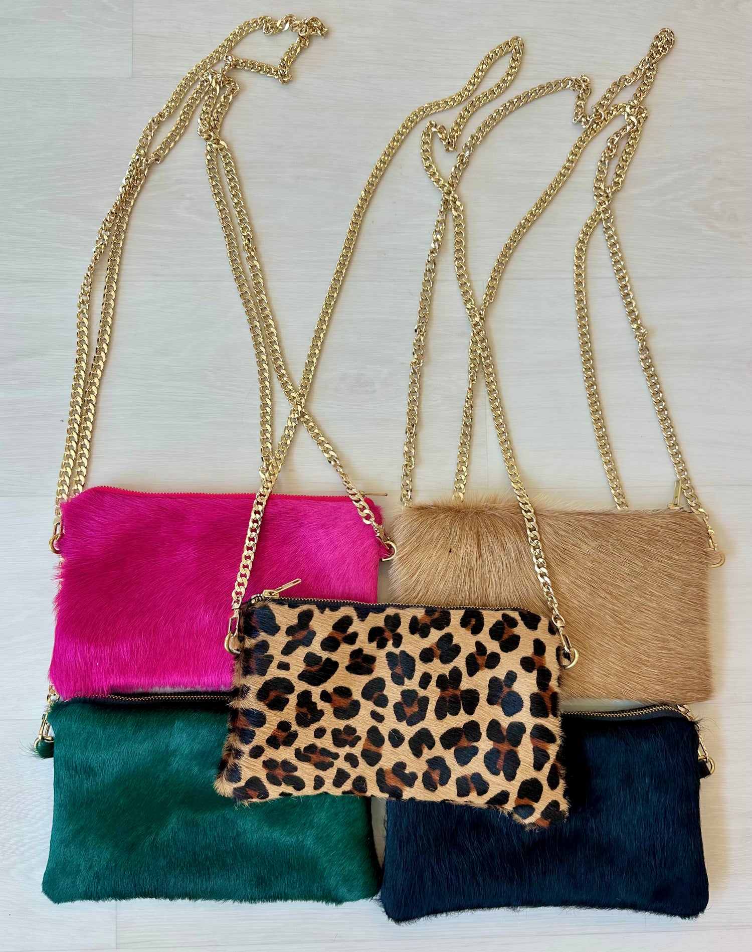 The premium Brazilian "hair on hide" leather and contrast stitching are the details that make this handheld bag extra special. Each bag is handmade in Dallas, TX, as cowhide is a natural product, each bag has individual, unique characteristics and markings of the natural hide…no two pieces will ever be the same. Nature’s natural markings are a feature of genuine beauty.