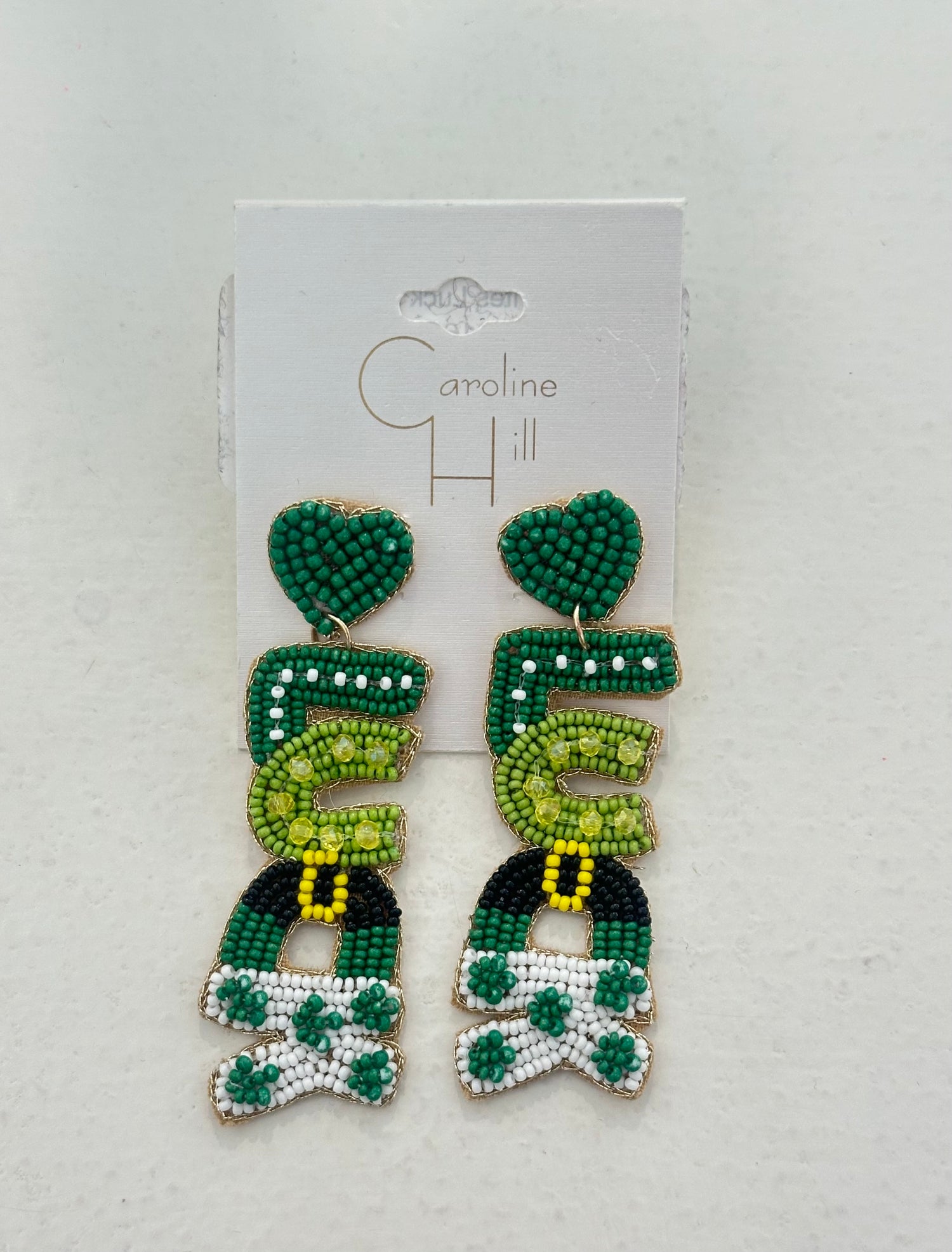 Add a little charm to your look with the Caroline Hill "Luck" Drop Earrings — a festive favorite for St. Patrick’s Day and beyond. These handcrafted statement earrings feature a sweet beaded heart top in green, leading into the word LUCK spelled out in playful, block-style letters. Each letter is delicately beaded in varying tones of green and white for a dimensional look, with a tiny black belt accent added for a whimsical nod to leprechaun style. Lightweight and full of personality, these earrings bring the perfect pop of holiday cheer to any outfit.