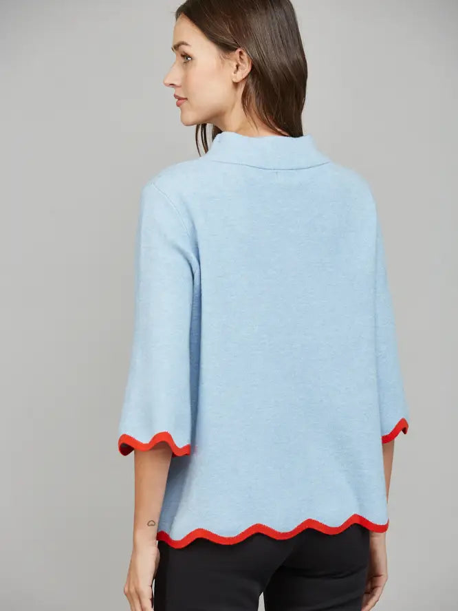Add a playful twist to your cozy layers with this chic scalloped sweater. The classic blue base sets a timeless tone, while the bold red trim brings a vibrant, eye-catching pop. Featuring a flattering A-line silhouette, 3/4 sleeves, and a soft knit feel, this piece pairs perfectly with denim for everyday style or elevates easily with tailored pants and heels. A favorite for effortless charm with a lively touch.