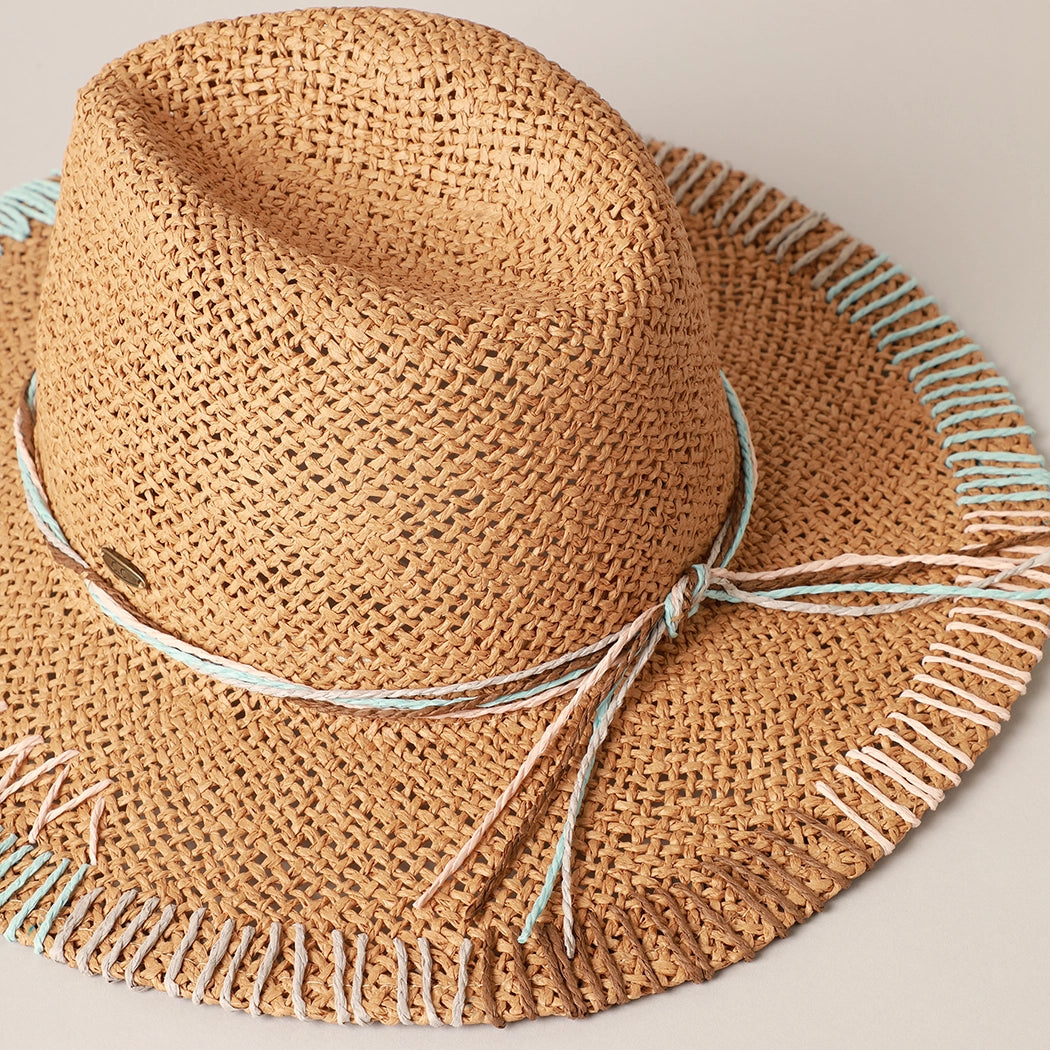 Multi-Colored Stitched Brim Panama Hat - Size: One Size Fits All (Adjustable Drawstring Attached) Brim Approximately 3.5"