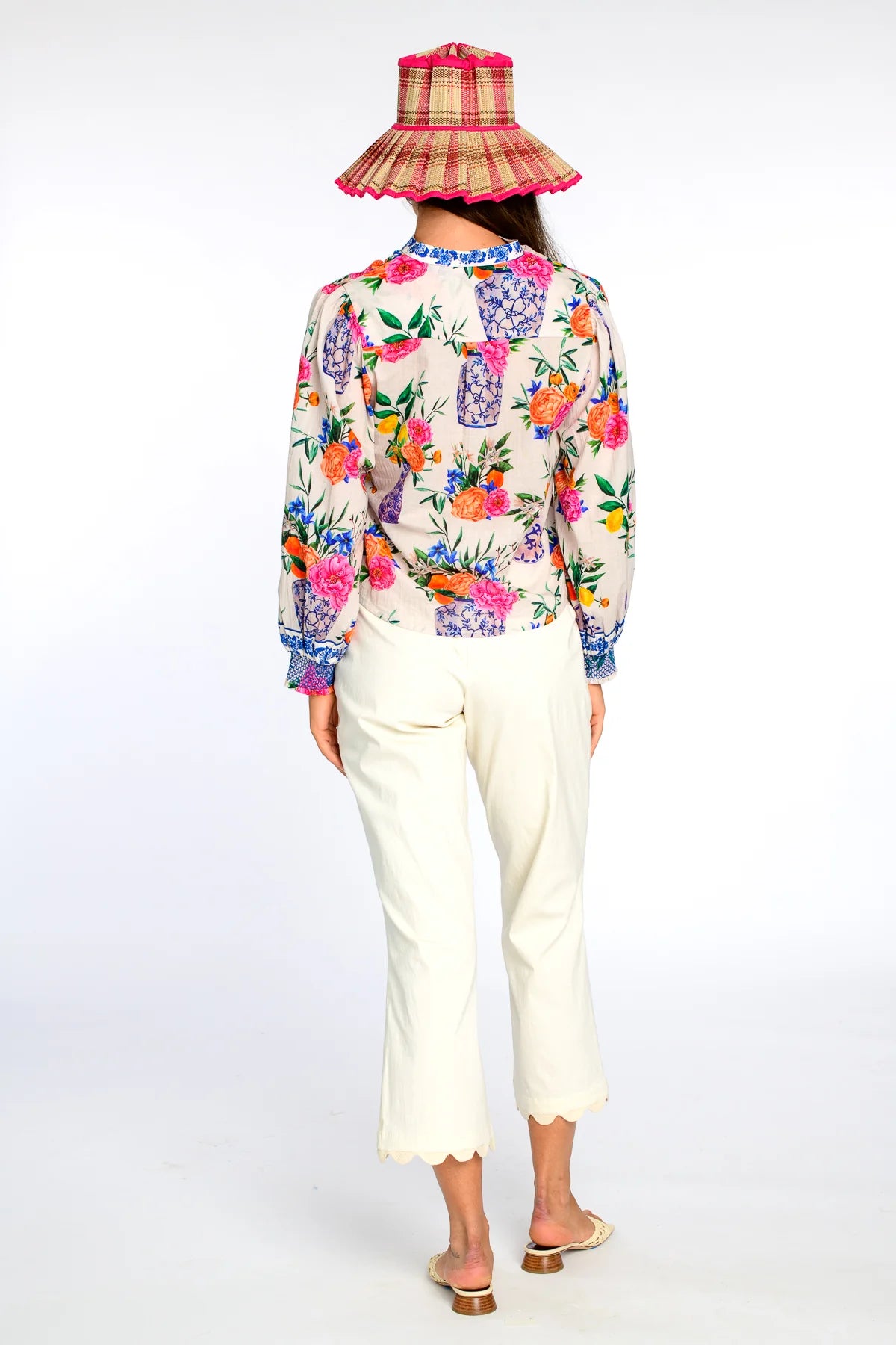 Cut from a light cotton blend fabric, the Emily Top in Ivory Ginger Jars is the perfect button-down to dress up or down this season. She features a mandarin collar, covered placket, balloon sleeves, and a decorative border trim.