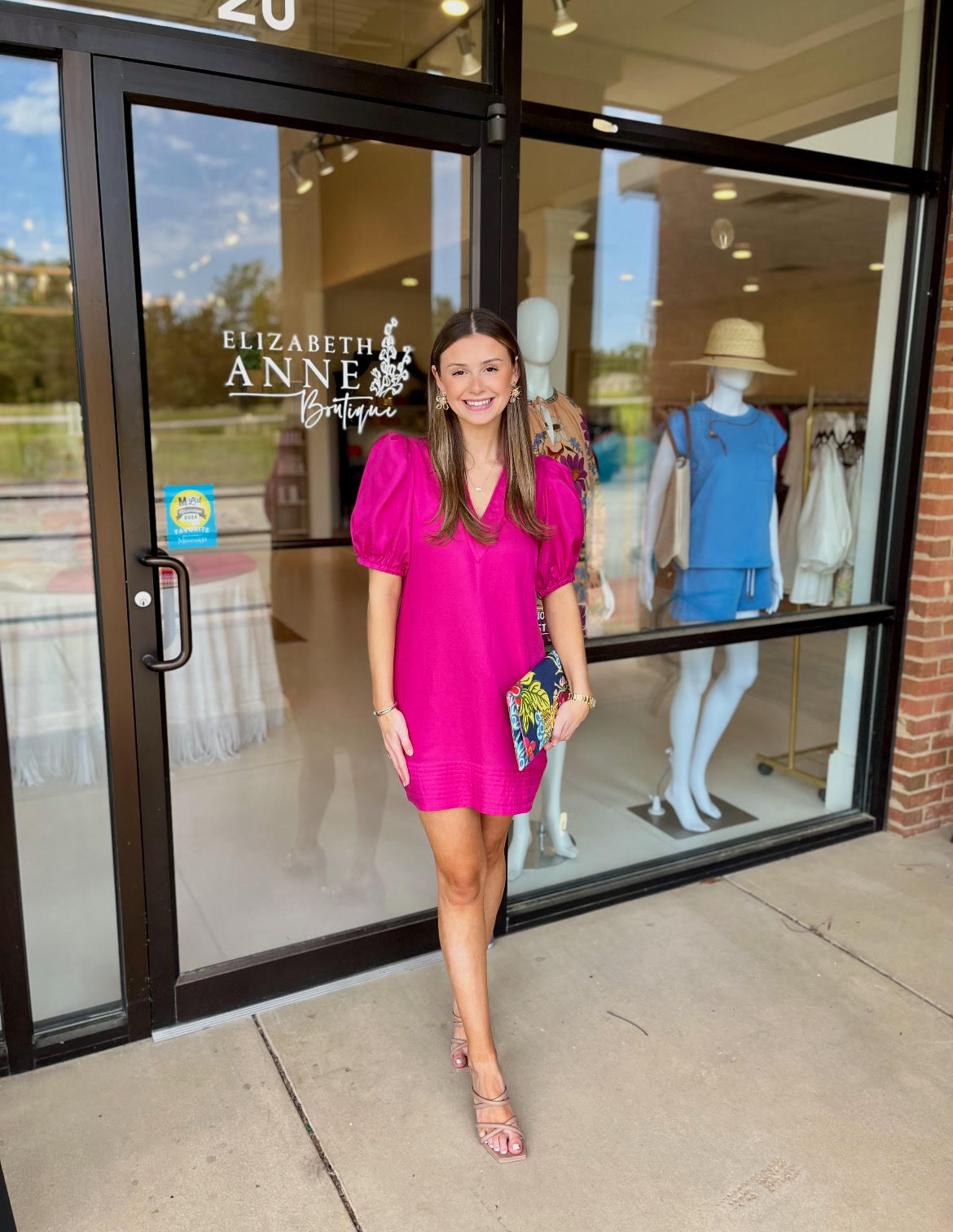 The Hampton Mini is a refined mini dress with incredible attention to detail. Its Mandarin collar and hem are framed by delicate stitching, while puff sleeves create a feminine and playful silhouette. With a stylish and chic berry pin color this dress is a unique blend of southern charm and sophisticated elegance. With such versatility, this dress was designed to translate from day to night with your favorite sneakers to your go-to heel!