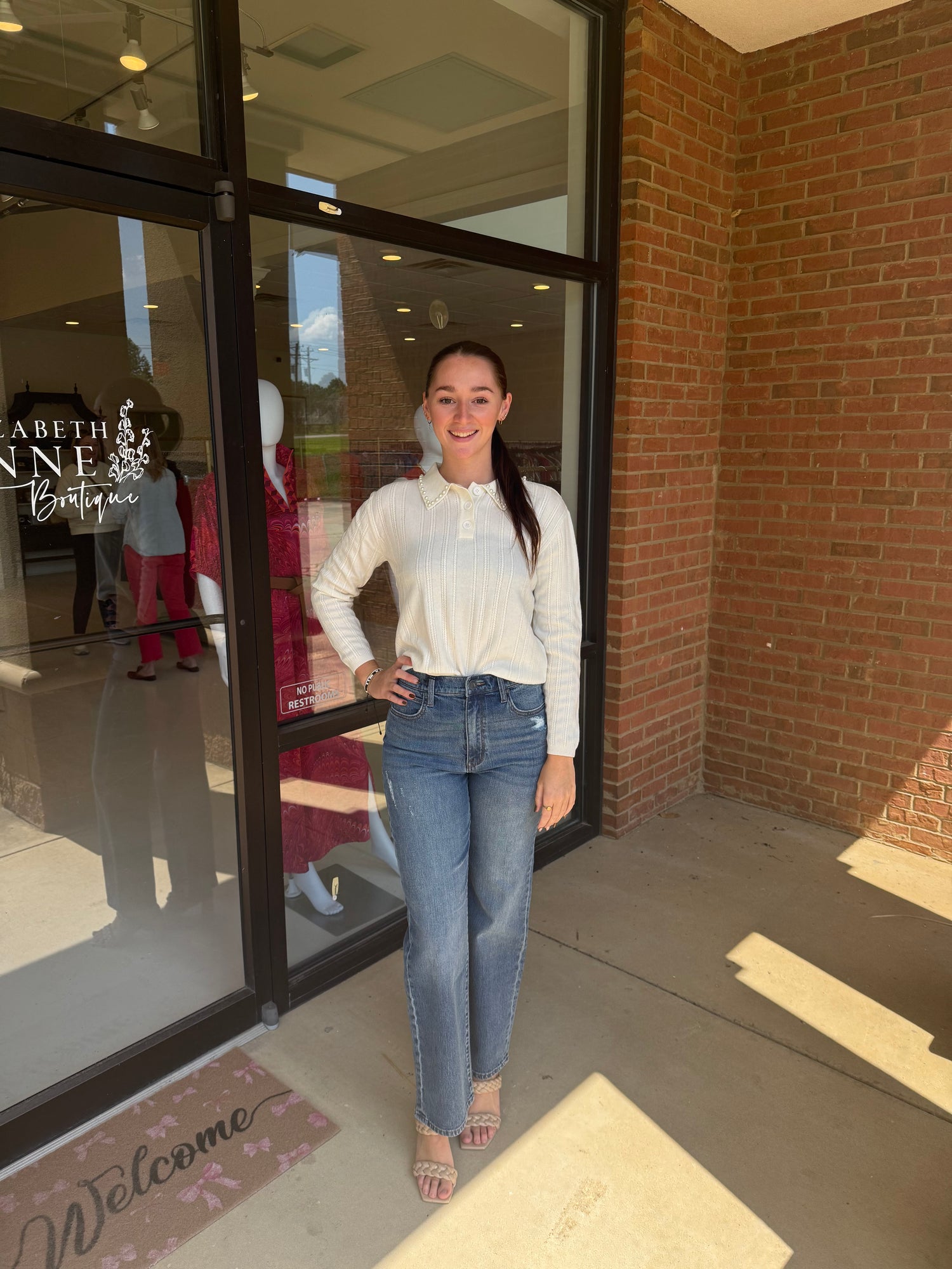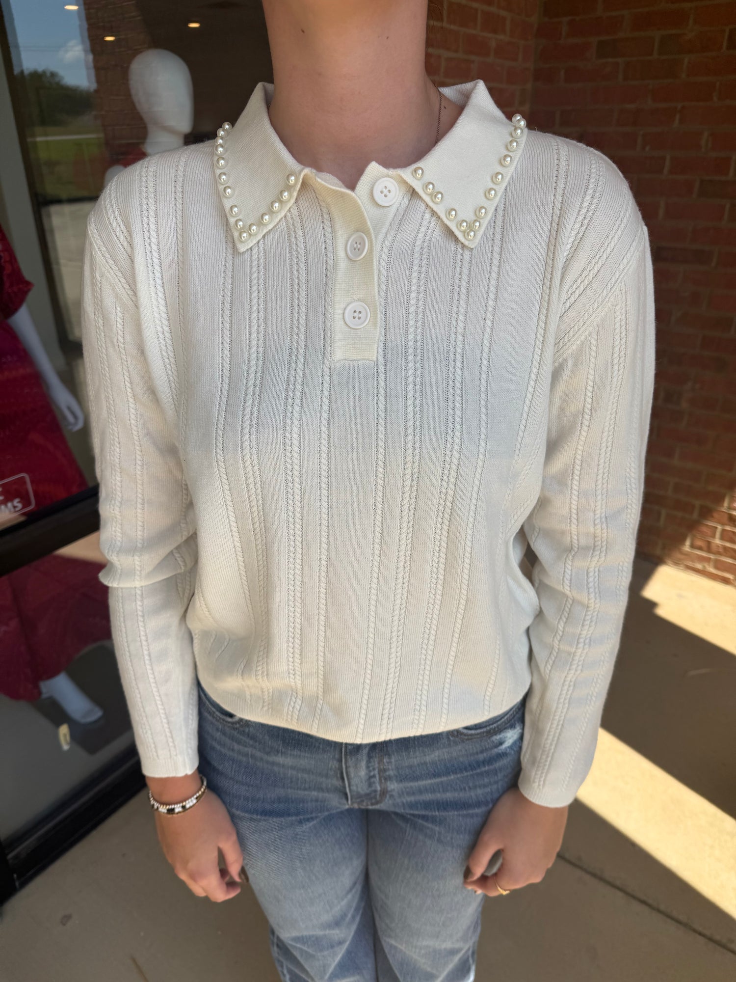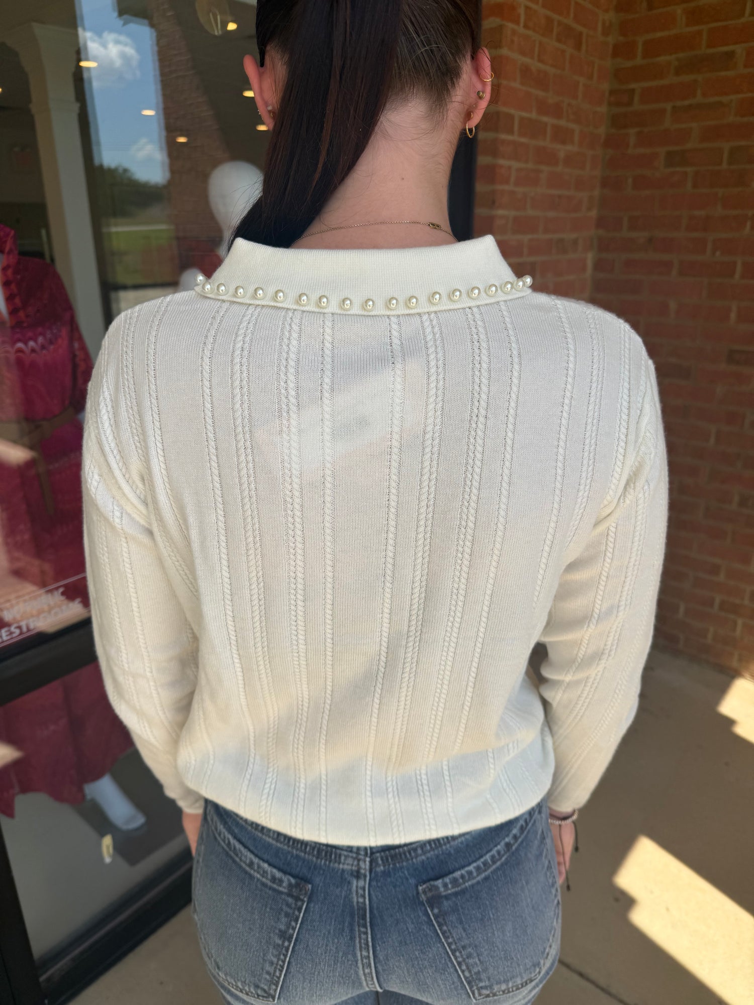 Add a touch of timeless elegance to your wardrobe with Esqualo’s Collared Knit Sweater in off-white. Featuring a delicate pearl-lined collar and a three-button placket for classic charm, this sweater is crafted with a beautiful textured knit pattern that feels both cozy and refined. Effortlessly chic, it’s the perfect piece to dress up your everyday look or pair with tailored bottoms for a polished finish.