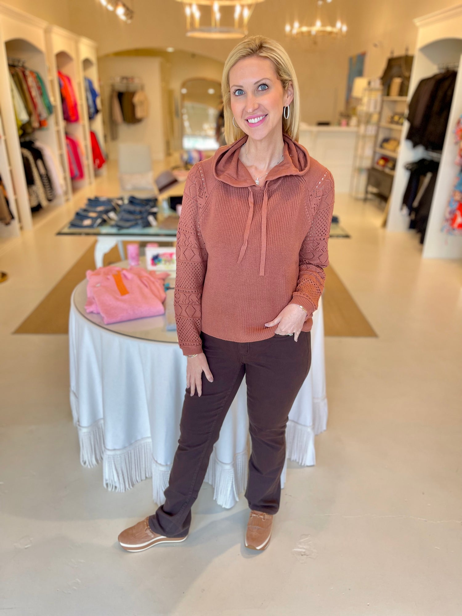 Look cozy and cool with this hooded crochet sleeve sweater! Available in the prettiest color to match you and your wardrobe.