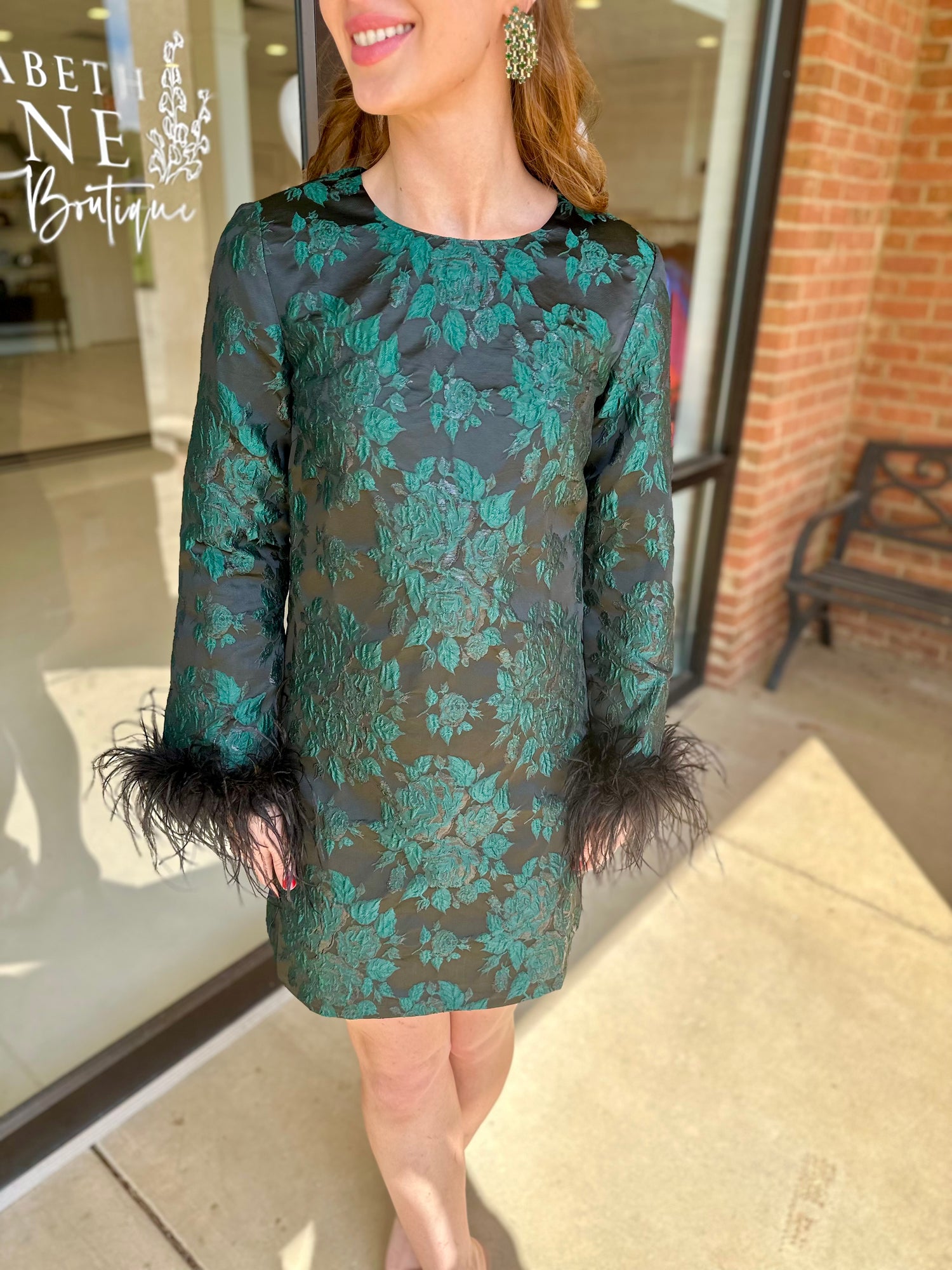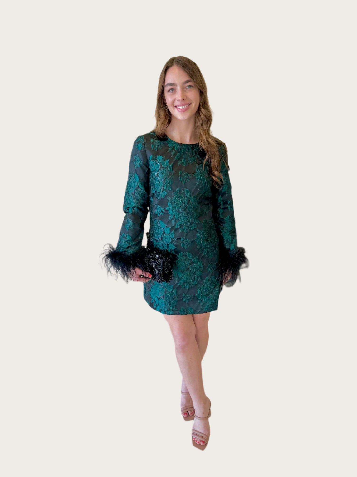 The Kylen Dress in Forest Oak is a striking piece featuring a round neckline and a tailored fit. It boasts an intricate green floral embroidery against a black base, creating a captivating contrast. The standout feature is its black feathered sleeves, which add a touch of drama and sophistication. This dress beautifully combines elegance with bold details, making it perfect for making a statement at any event.