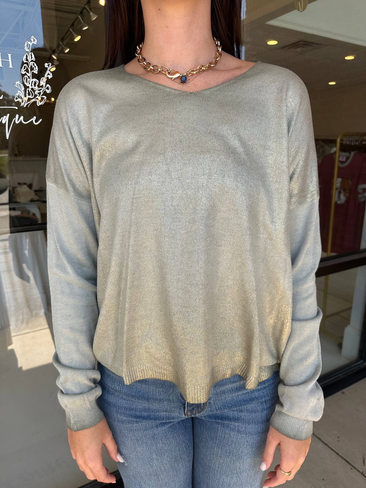 Elevate your everyday style with this lightweight metallic sweater. Featuring a subtle shimmer finish, relaxed fit, and a flattering v-neckline, it’s the perfect blend of casual and chic. The long sleeves and soft knit fabric make it cozy enough for cooler days while the luminous sheen adds just the right amount of glam. Pair it with jeans for a laid-back look or dress it up with leather pants and heels for a night out.