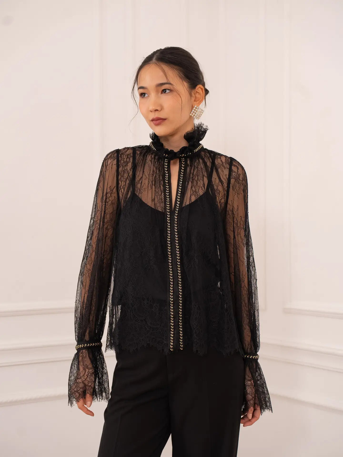 Crafted with delicate sheer lace, it features a high ruffled neckline, elegant long sleeves finished with flared lace cuffs, and intricate gold trim that adds a touch of luxe from top to hem. A soft camisole lining ensures effortless wear while preserving the blouse’s ethereal, sophisticated look.