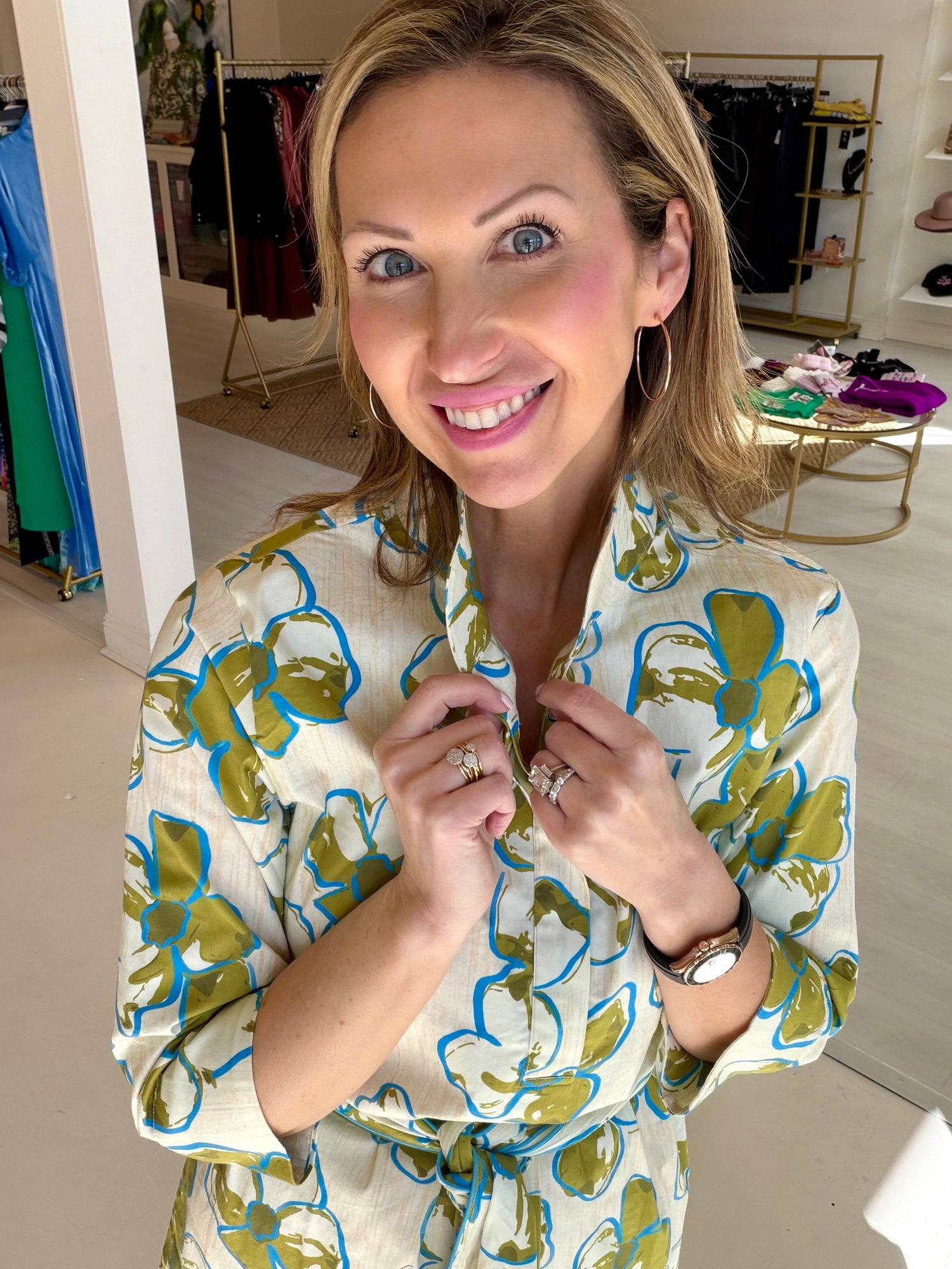 Easy elegance meets everyday polish in this timeless floral shirt dress. Designed with a classic collared neckline and button-front silhouette, this piece features a flattering self-tie waist that cinches you in just right. The soft neutral base is elevated with an artistic floral print in olive and soft blue tones—fresh, feminine, and effortlessly chic. Finished with three-quarter sleeves and a midi-length hem, it’s perfect for workdays, brunch dates, church, or spring events.