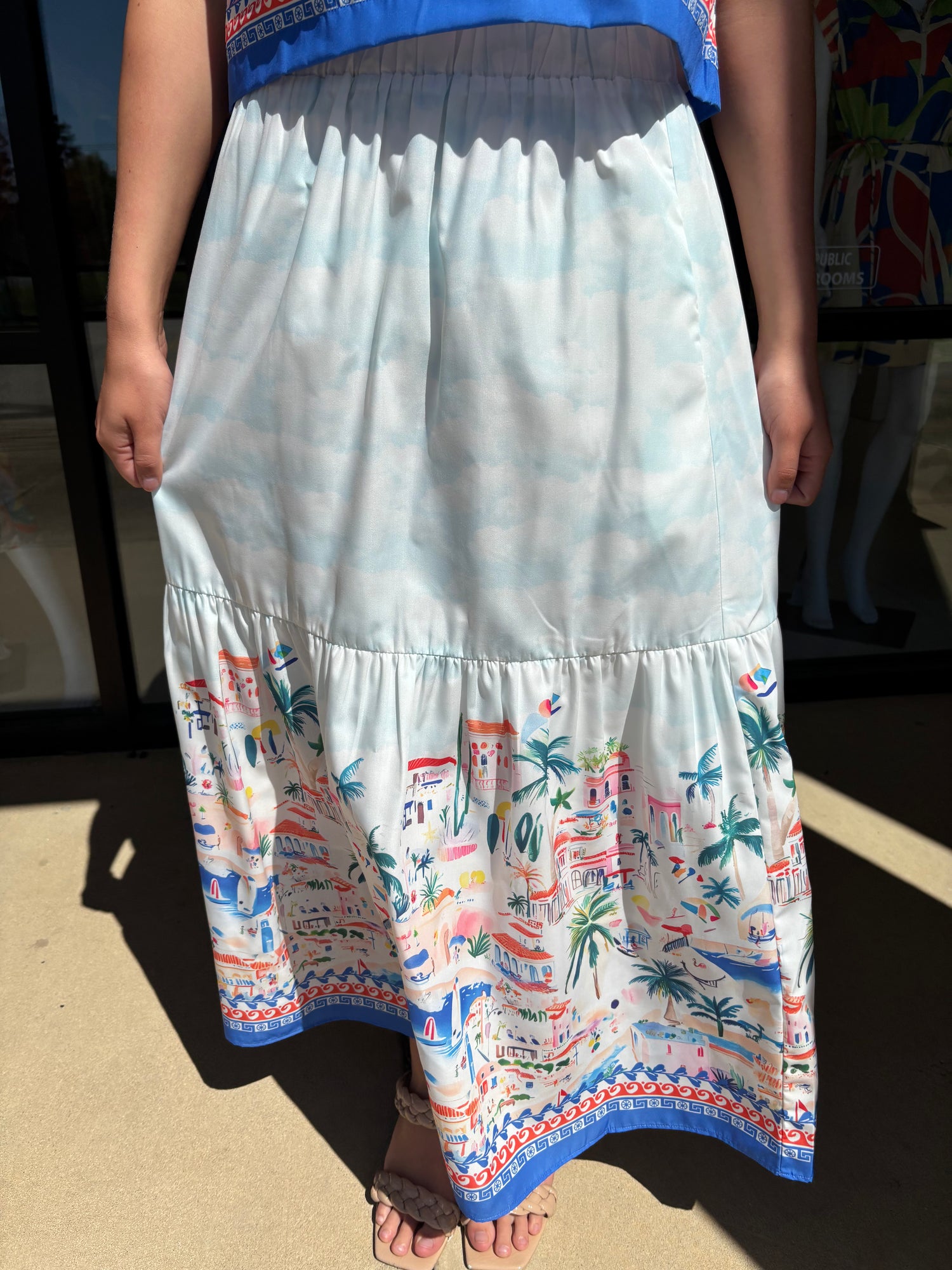 The Joy Joy Maxi Skirt – Seaside Village is a graceful statement piece that captures the charm of coastal living. Featuring a vibrant seaside-inspired print, this flowing maxi silhouette moves beautifully with every step. Designed with a flattering waistband and lightweight fabric, it offers both comfort and effortless elegance. Perfect for pairing with a simple blouse or the matching top, this skirt brings a fresh, polished touch to any warm-weather wardrobe.