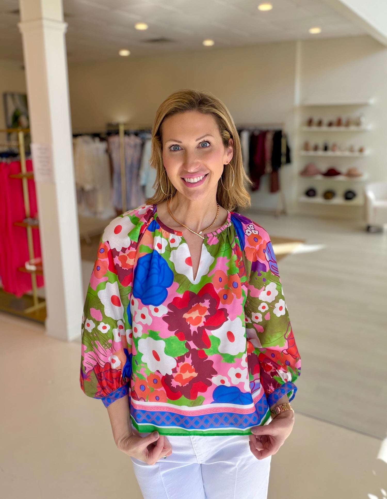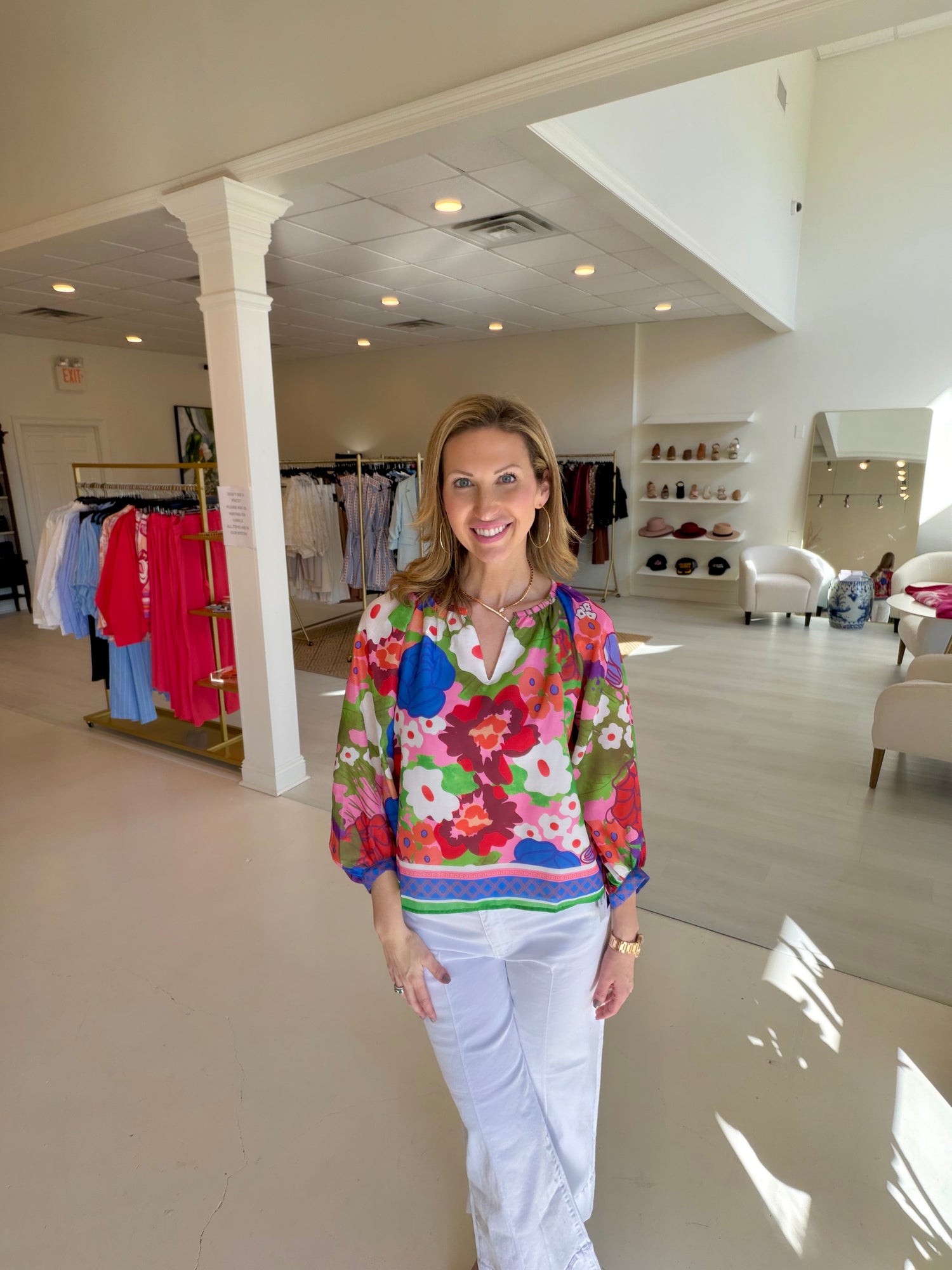 Bright, bold, and beautifully feminine, this vibrant floral blouse brings instant joy to your wardrobe. Featuring a lively mix of pink, green, blue, and red blooms, this top is designed to stand out while remaining effortlessly wearable. The relaxed silhouette, soft gathered neckline, and three-quarter sleeves create a flattering, easy fit that pairs perfectly with white denim, tailored shorts, or your favorite everyday bottoms.