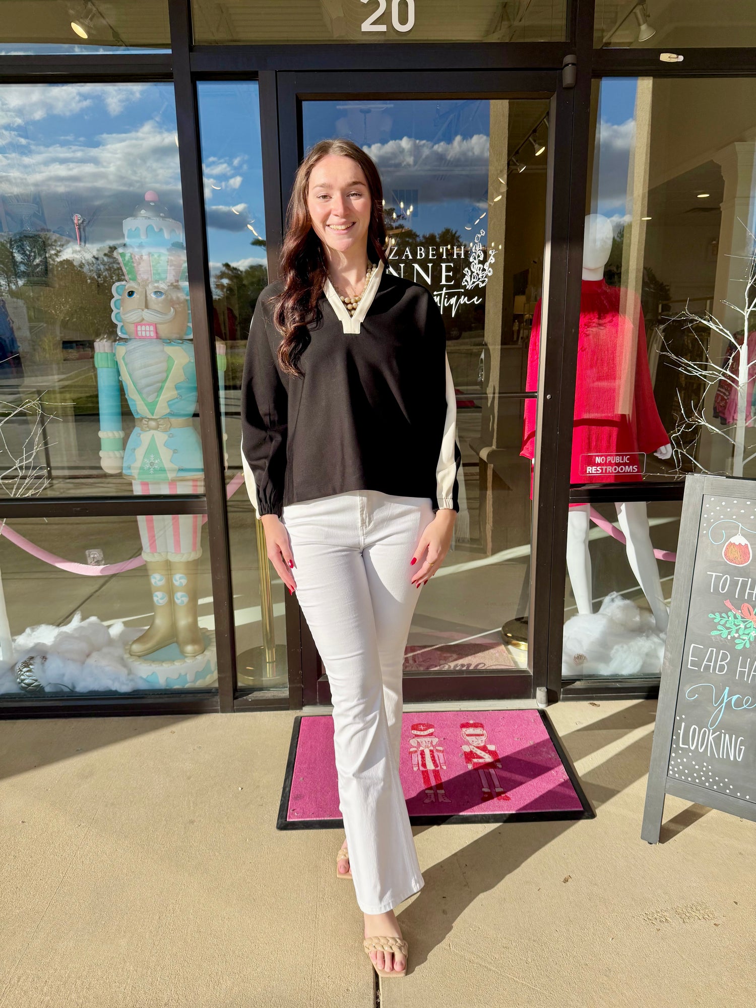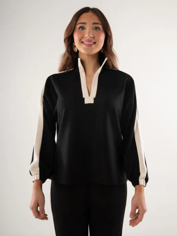 Emily McCarthy Signature Poppy Top in ponte. A classic statement piece for any occasion featuring a loose fitting body, optional stand up collar, and loose elastic dolman sleeves. Crafted in our best selling ponte fabric that provides comfortable softness and supportive stretch.
