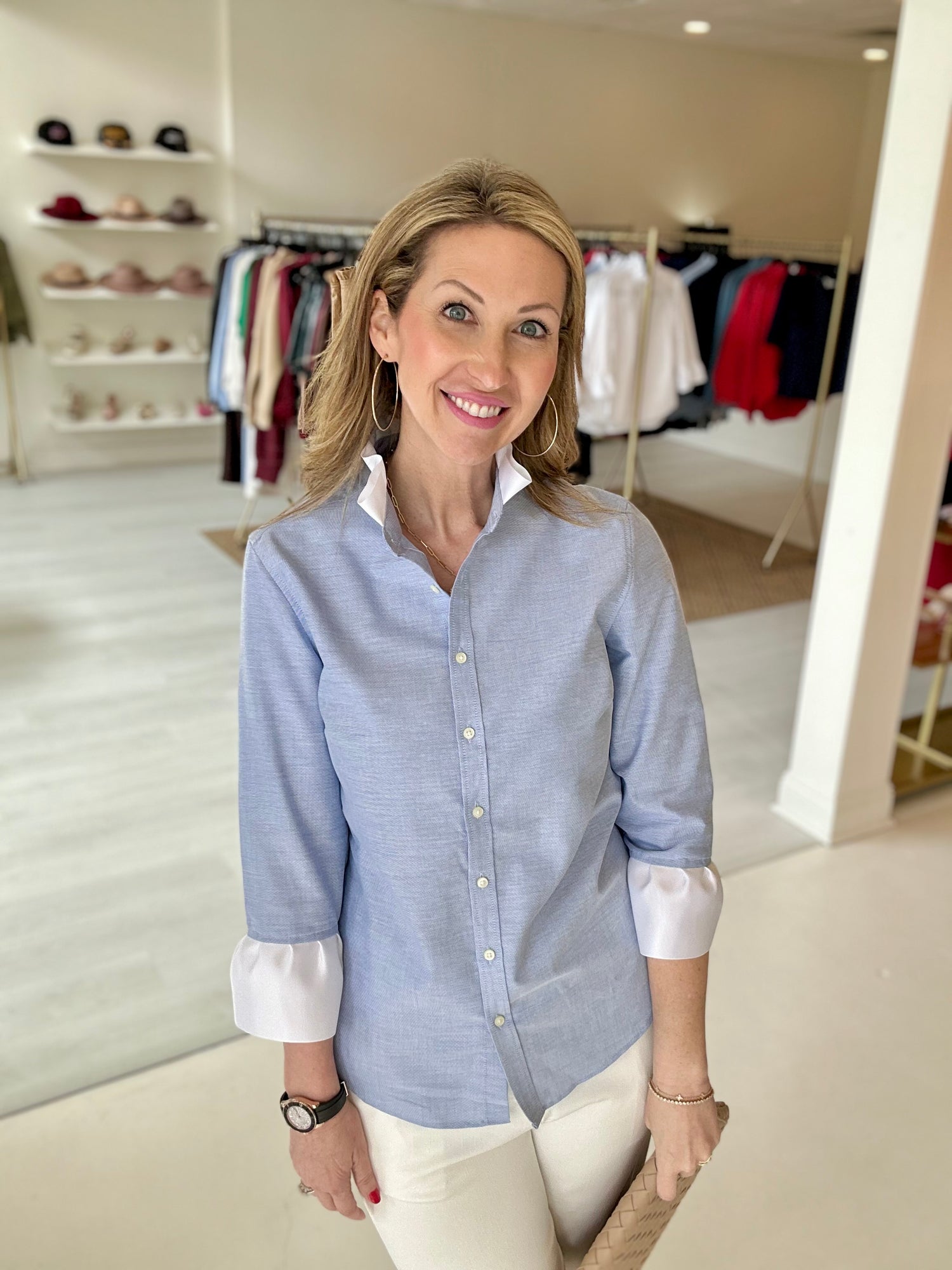 The Scarlett Oxford Ribbon Trim 3/4 Sleeve Top in Blue is a polished classic with a feminine twist. Designed in a crisp oxford fabric, this top features smart tailoring balanced by delicate ribbon trim accents for a touch of charm. The 3/4 sleeves add an effortlessly chic finish, making it perfect for both professional and casual styling. A versatile wardrobe staple that pairs beautifully with trousers, denim, or skirts for a refined look.