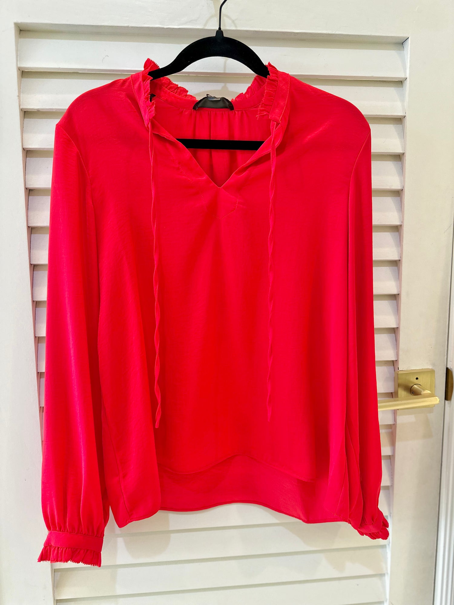 This Ferrari Red Blouse is so vibrant, back in the classic air flow fabric! This Air Flow Fabric is environmentally friendly dye method has been used for the fabric of this garment. Air flow dyeing is an innovative process resulting in less energy and water consumption.