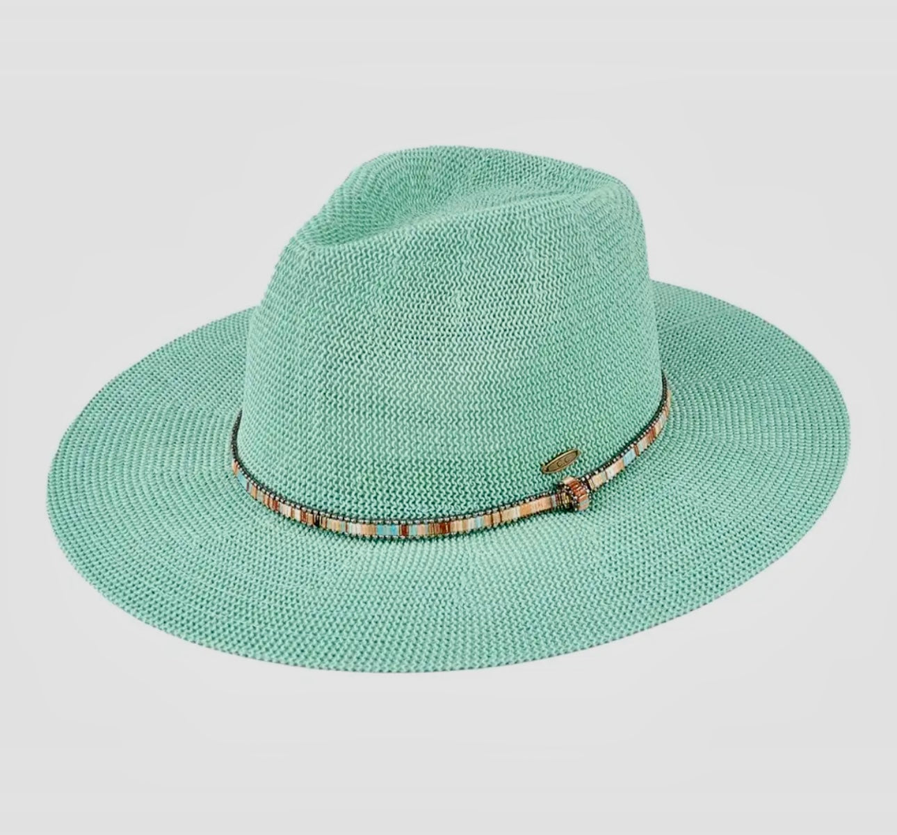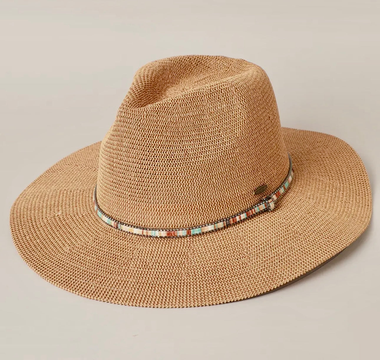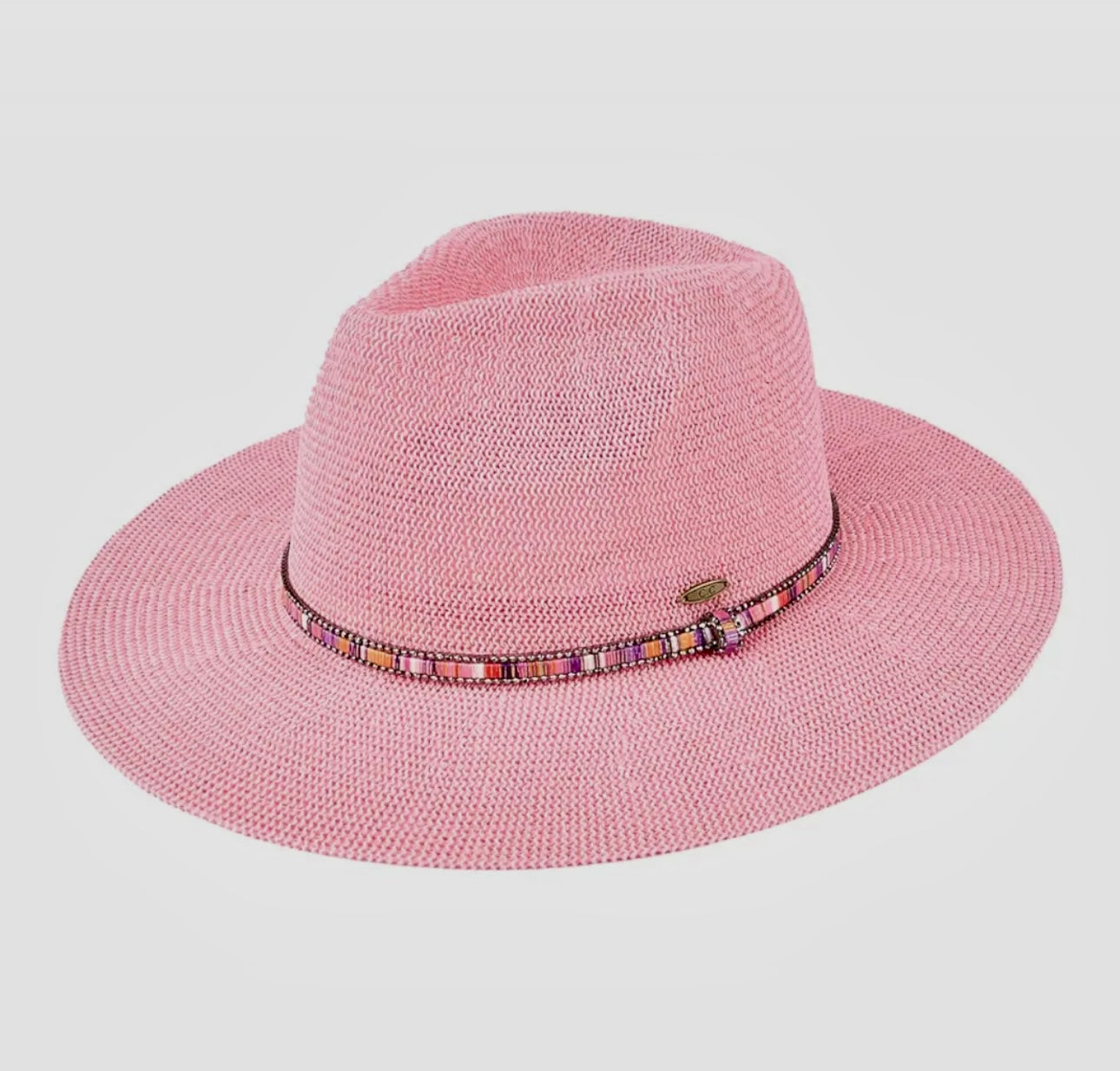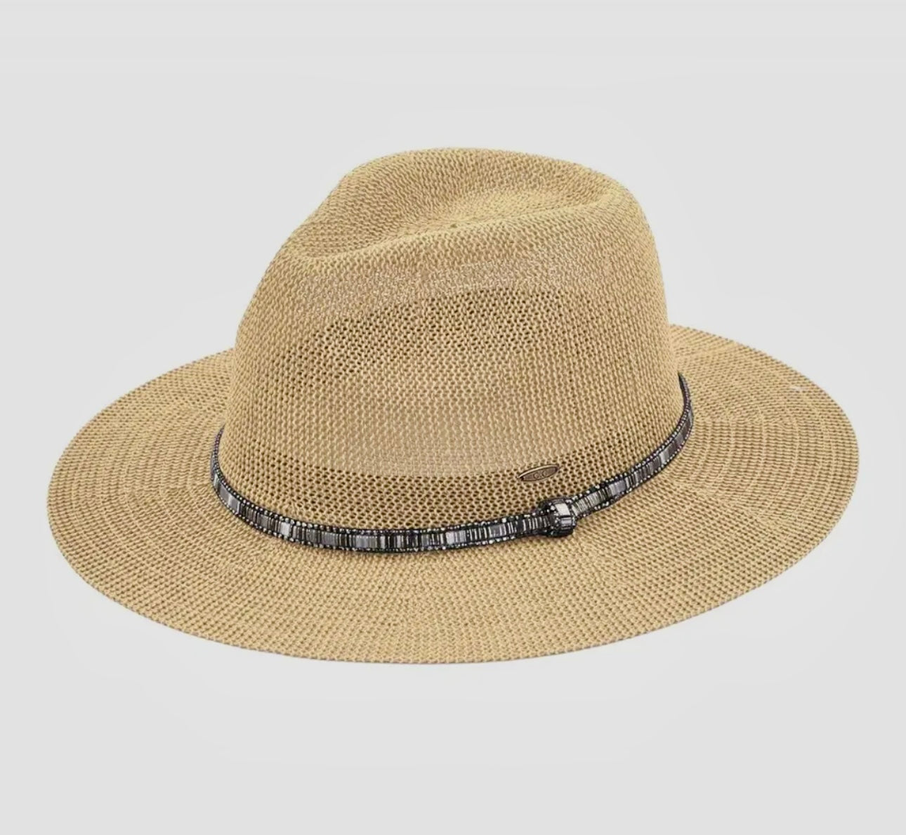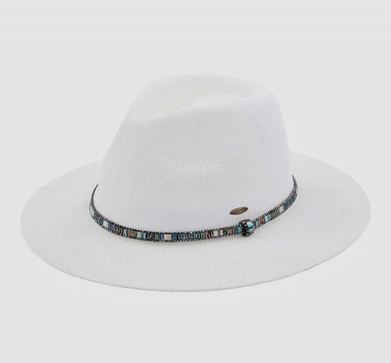 Adjustable straw Panama hat with beaded band. Perfect for summer, traveling wearing anywhere you need protection from the sun.