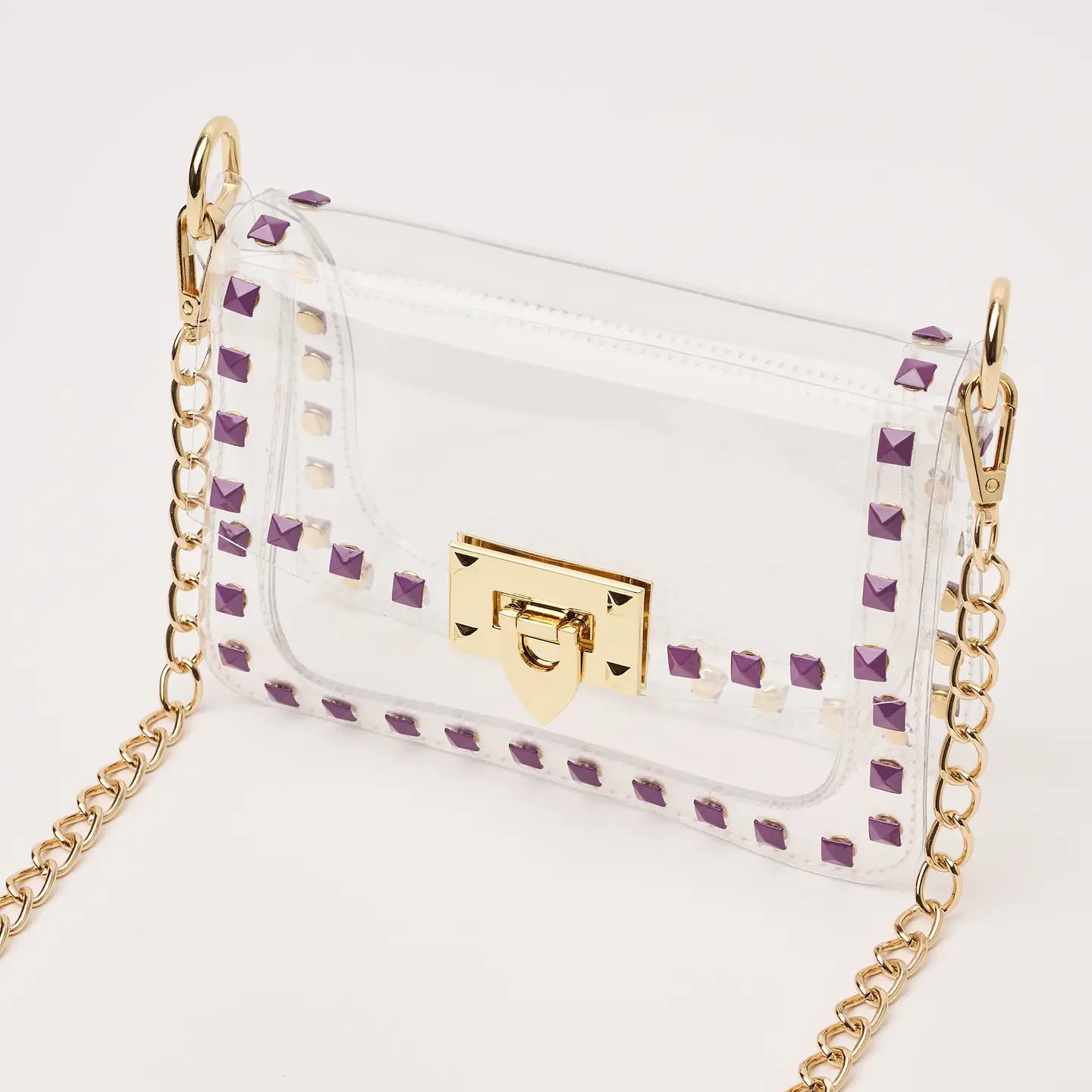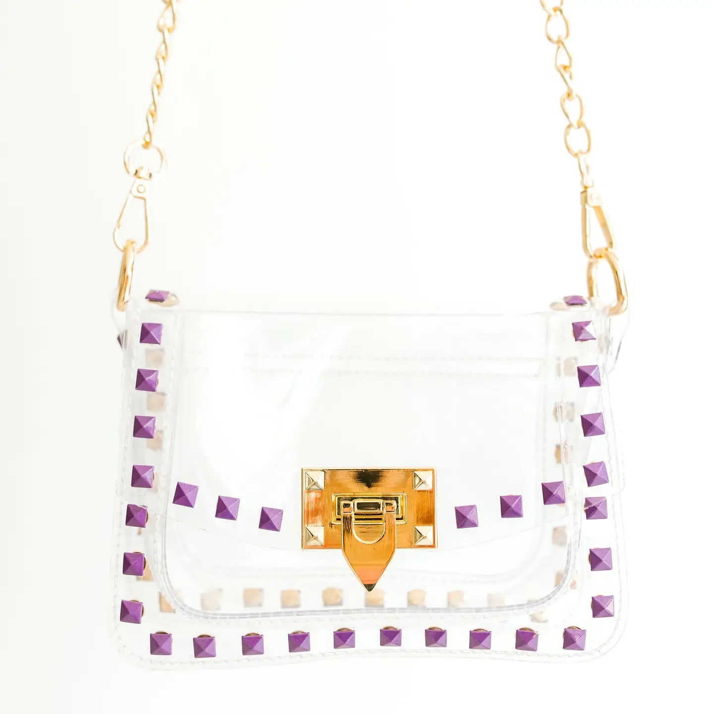 Score with the biggest winner in our clear handbag playbook - The Jackie! The Jackie changed the handbag game by proving clear handbags could be both functional and chic. This style includes purple square metal studs and a gold chain. The Jackie is NCAA and NFL-compliant and the ideal size to hold your wallet, phone, keys, lip gloss and a few other small items.