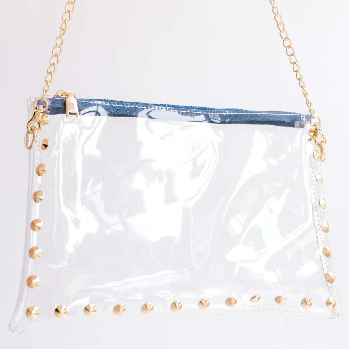 Let out a cheer for The Parker! This slim clear bag includes a blue zipper trim and gold stud detail. The Parker is the perfect size to hold your wallet, keys, phone, lip gloss and a few other of your favorite necessities. The Parker in Blue is not only cute but also functional and complies with NCAA, NFL and other event/stadium entry requirements.