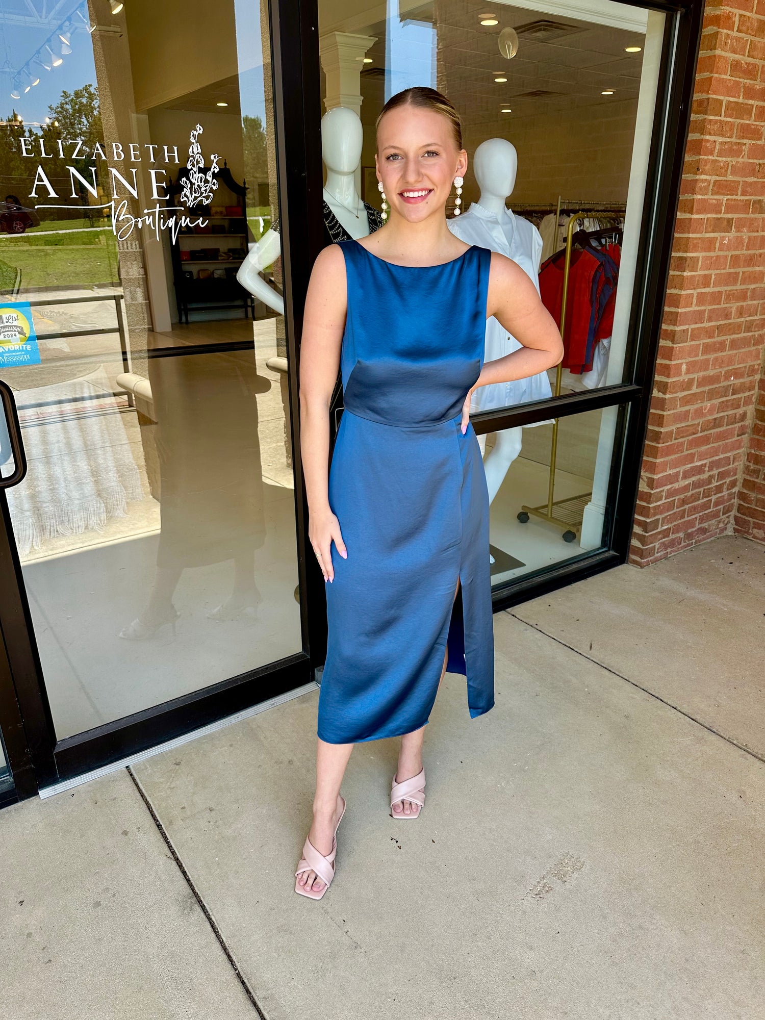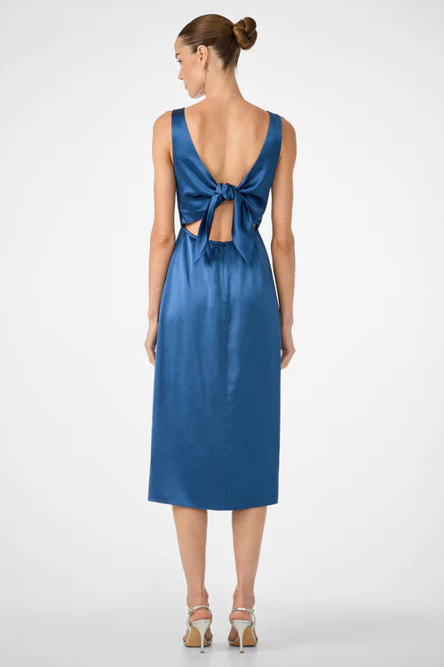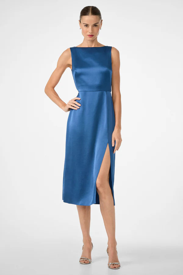 Romantic dates and outdoor events call for this stunning boatneck dress. This fitted, straight dress features a midi length, bust darts, a front slit for ease of movement, and a flattering back tie for an open-back style. Its lightweight drapey viscose satin makes it a summer essential dress.