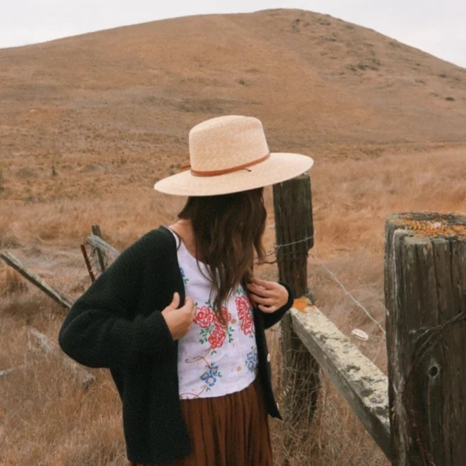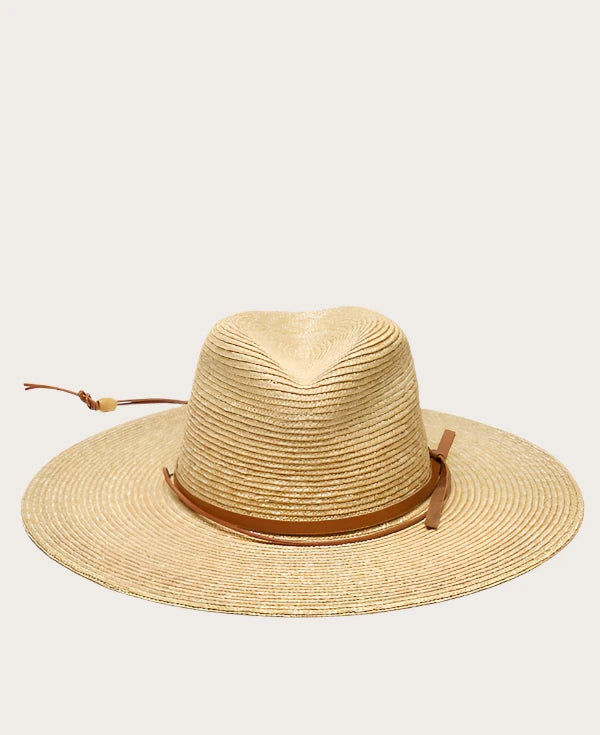 Natural straw hat with adjustable strap. Leather band to keep hat in place. Our Harley wide brim, high crown, wheat straw hat features a genuine leather trim finished in a simple knot and a stampede strap, making it the perfect accessory to keep you covered on a windy beach day or on a sunny hike.